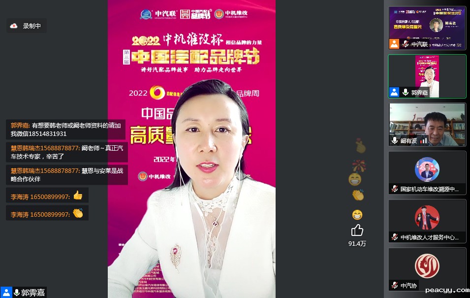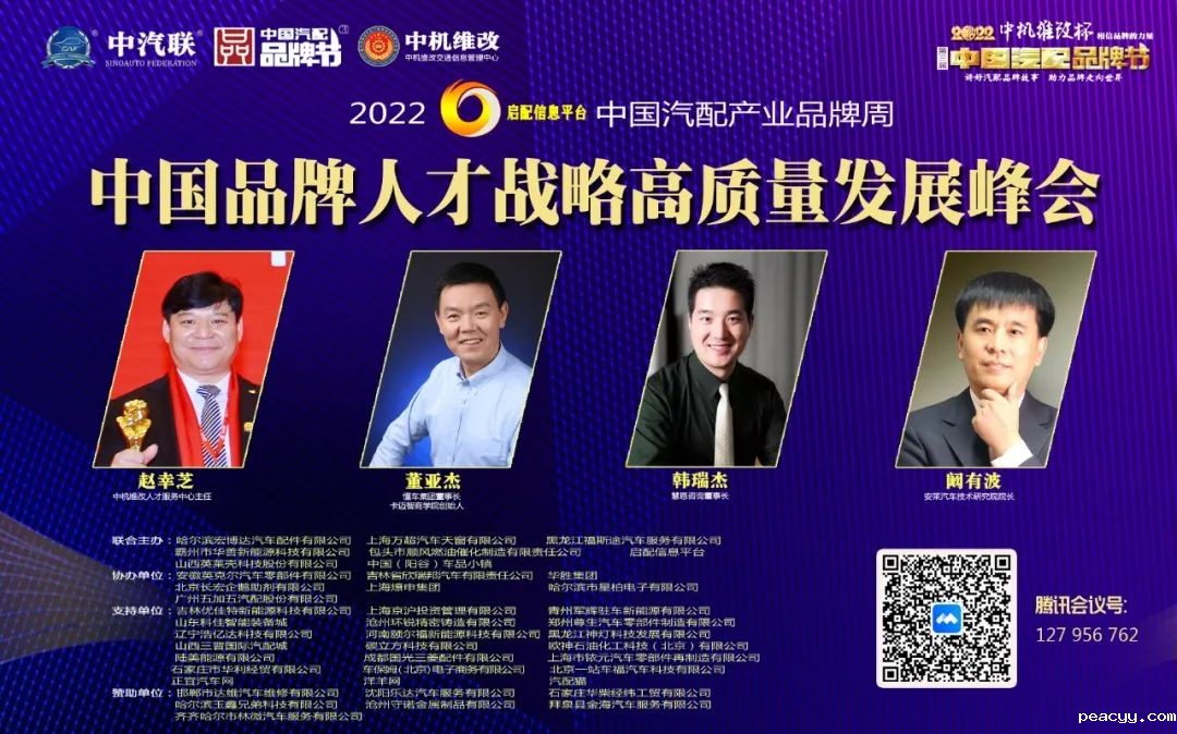2022年6月9日,“2022 启配信息平台杯 中国汽配产业品牌周”的第四场活动,由 中机维改人才交流中心 特约冠名播出的2022中国品牌人才战略高质量发展峰会 在线上成功举行,中机维改人才服务中心主任赵幸芝,懂车集团董事长、卡迈智商学院创始人董亚杰,慧恩咨询董事长韩瑞杰,安莱汽车技术研究院院长阚有波 等四位汽配平台大咖出席汽配产业品牌周并做了精彩分享,引起了广泛关注,点赞数量达到98万个。