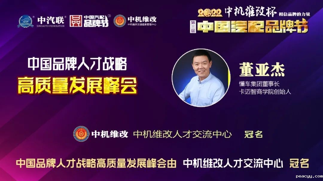 懂车集团董事长、卡迈智商学院创始人董亚杰 出席2022中国品牌人才战略高质量发展峰会并作了精彩分享。董总是汽车后市场实体门店连锁企业+培训教育第一人,也是汽车后市场唯一一位清华+北大汽车专业EMBA双学历的企业家,现任懂车集团董事长,懂车连锁创始人,卡迈智商学院创始人、懂车学院创始人、懂车大学创始人。