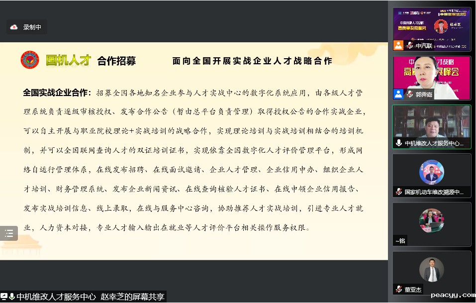 赵主任从国家政策、人才分析、发展趋势等角度进行了诠释,也讲解了国家在人才战略方面的要求。全国职业技能人才评价教培信息公共服务平台是在人社部教育培训中心指导下,由中机维改人才服务中心负责开发运营的多系统、多应用、线上线下相结合、全方位、多维一体的互联互通、信息共享的人才数字化应用管理平台。他们获得国家人社部颁发的《人力资源服务许可证》和《人力资源服务备案证》,主要负责人力资源供求信息的收集和发布,就业和创业指导,人力资源管理咨询、人力资源测评,人力资源培训,人力资源评估,人力资源档案管理,人力资源服务外包等专业服务,根据国家有关规定从事互联网人力资源信息服务,针对人才、企业、院校开展信息互通网络公共数据汇总与发布公示工作。他希望下一步行业人才培训机构进行全国联动,培养适应新四化发展的实战人才,为汽车强国梦作出新的贡献。